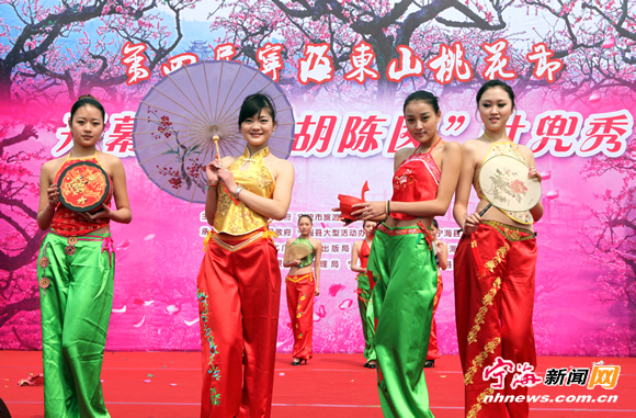 宁海新闻网讯 “梦里果乡、多彩胡陈”,昨日上午,由宁海县人民政府、宁波市旅游局、浙江省农业科学院主办的第四届宁海东山桃花节开幕式暨“胡陈囡”肚兜秀在胡陈乡东山桃园举行,来自新华社及省、市有关媒体的近百名记者相聚胡陈桃花林,感受阳春三月江南宁海的美丽景色。县领导俞小勋、王建云、娄黛敏、赵秀萍参加开幕式。图为肚兜走秀(古典系列)《春晓》。 (李江林 胡燕红 摄) |