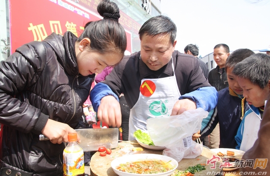 宁海新闻网讯为了更好地倡导健康生活,养成科学营养合理的饮食习惯,近日,一场以“合理饮食健康生活”为宗旨的家庭好“煮妇”加贝第二届厨艺大赛在加贝超市小广场火热进行,奏响了一曲“锅碗瓢盆合奏曲”。此次比赛共有15名选手,评委对参赛菜肴不仅有“色、香、味、形”的要求,还以营养健康指数来评分。图为选手中唯一的男“煮妇”正忙得不亦乐乎。(惠广亮陨石摄) |