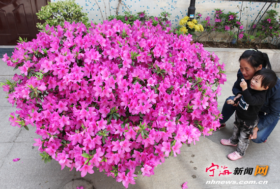宁海新闻网讯 家住城区南门解放路的杨先生昨日来电称,家里种的一棵杜鹃花堪称杜鹃花王。记者在杨先生家看到,该杜鹃花直径达到了近2米,周长有5米多,绵绵密密地盛开着花朵,煞是好看。据杨先生说,此花已经种植了20多年,种下时直径只有30几厘米,花开的是一年比一年茂盛,都换了几次花盆了。 (记者 惠广亮 摄) |