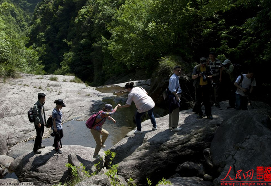 宁海新闻网讯 5月7日—8日,人民网组织了13名资深网友走进宁海,通过走访徐霞客古道、国家登山步道,以“图说宁海”的方式采写了“寻找一粒时间胶囊——宁海前童古镇”,“现代霞客行——浙江宁海”,“浙江宁海登山步道游记——3公里穿越400年”,“又苦又累又来劲,看叨叨驴行宁海”等一批精彩的帖文,连续被推荐到人民网《图说中国》的社区首页上。图为网友们正在穿越宁海龙宫。(社员 王银宁摄) |