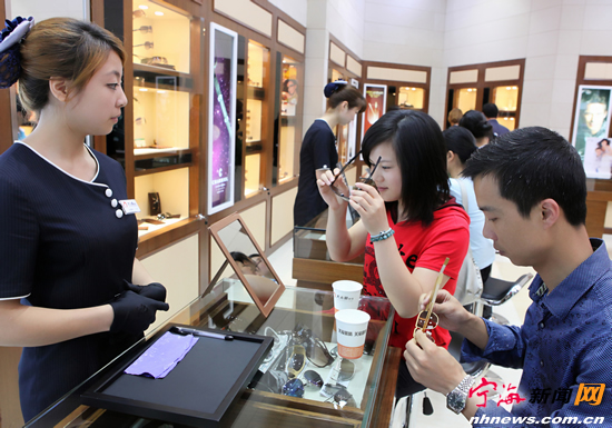 宁海新闻网讯 5月18日,第九届中国徐霞客开游节指定眼镜——大光明眼镜名品店盛装开业,罗伯图·卡维里、迪奥、万宝龙、都彭、埃德·哈廸及泰格豪雅等世界著名品牌的太阳镜和光学架闪亮登场。随着市民消费水平的提高,对之前望而却步的名品眼镜也敢于出手,为品牌一掷千金。图为消费者在名品店挑选太阳镜。(记者李江林摄) |