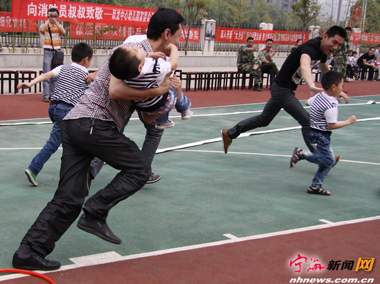 宁海新闻网讯 前日,跃龙中心幼儿园家委会的家长与孩子正在县消防大队进行“火场救生”亲子比赛。为提高家长和孩子的消防安全意识,熟悉掌握基本的消防技能与火海自救逃生本领,该园组织家委会成员与孩子来到县消防大队参观学习,并与消防队员一起开展“我是消防员”、“火场救生”、“叠被子”等亲子比赛活动。 (记者惠广亮摄) |