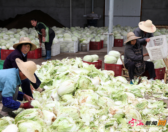 宁海新闻网讯 昨日上午,宁海县丰博农业种植专业合作社的社员们,正在整理冷藏在冷库里的大白菜。面对去年冬天卖菜难问题,合作社将去年收割的350多万公斤白菜冷藏在冷库里,现在大白菜收购价已由原来的每公斤0.15元左右上涨到每公斤0.6元以上,畅销上海、宁波等地。(李江林苏敏萱摄)
