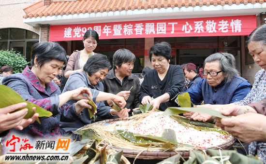 宁海新闻网讯 端午佳节即将来临,为了让福利院里的老人们也能吃上传统的粽子,昨日,跃龙街道园丁社区的党员、居民志愿者买来糯米、箬叶及配料红豆、蜜枣等来到县闻裕顺福利院,现场为老人们包粽子。该院140多名老人每人都分到了四五个充满爱心的粽子。(惠广亮 葛亚华摄)