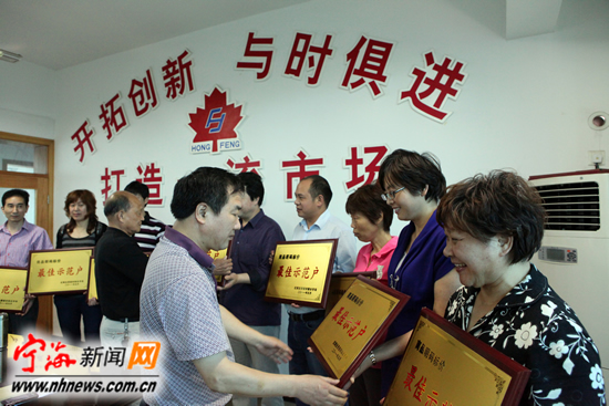 宁海新闻网讯 日前,县物价监督检查分局工作人员正在给红枫市场10家明码标价最佳示范户授牌。为规范市场管理,树立商品价格标杆,经市场综合考核,广大经营户推荐,最终在近400户经营户中评出邬志官、应端强等10户明码标价最佳示范户。 (李江林 徐炳文摄)