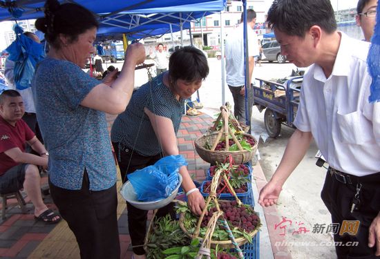 宁海新闻网讯 时下正是杨梅上市季节,县城市管理部门为了规范市场,组织人员在世贸中心和广电大楼北侧空地设置了两个销售点40个摊位,使自产自销的杨梅摊贩可以统一管理销售,让他们在销售点自我管理、自我调节,自觉维护经营秩序。 (李江林 方樱摄)