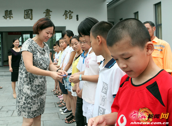 宁海新闻网讯 为丰富环卫工人子女暑假文化生活,县环卫处联合县图书馆,开展了以“想读书勤读书乐读书”为主题的环卫工人子女读书会活动。7月11日上午,19名孩子在家长的陪同下来到县图书馆参加免费读书会启动仪式,并领取图书馆免费借书卡。孩子们徜徉在图书的海洋里,家长们露出了欣慰的笑容。(李江林陈露岚摄) |