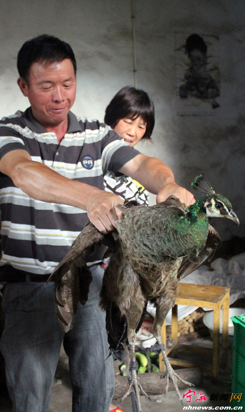 宁海新闻网讯 日前,大佳何镇南阳自然村村民葛兴满抓到了一只孔雀,这只孔雀背部、头部及尾部为绿色和浓褐色,全长近1米,头顶上高高耸立着羽冠,并泛着绿光。据介绍,这只孔雀已在附近的山中呆了近一个月,不时飞下山来找吃的,直到近日下山觅食时被村民葛兴满撞个正着。 (李江林何琼摄)