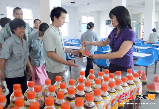 宁海新闻网讯 来来来……喝瓶冰红茶,吃块冰西瓜降降温。前日下午,宁波新升泰灯饰有限公司工会在高温期间安排下午2点全体员工短休,并将准备好的冰红茶冰西瓜放在食堂供员工享用。为切实做好夏季防暑降温工作,桥头胡街道总工会要求辖区各企业工会认真做好夏季高温安全生产和防暑降温工作,以确保各企业一线员工安全生产和身心健康。(李江林储玲琴摄) |