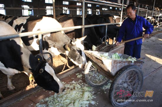 循环农业为园区内农民专业合作社和农业企业注入了蓬勃的发展动力。上图为金龙浦合作社生产的瓜果色泽诱人、价格数倍于其它普通瓜果。下图为利丰牧业的奶牛正在啃食废菜叶,利丰牧业立足循环农业园区,实现了稳步发展,目前饲养着优质高产奶牛1000余头。 |