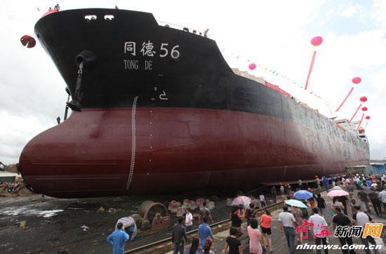 宁海新闻网讯 宁波同德海运公司是我县的一家民营企业,经过施工人员14个月的精心打造,昨日上午,同德56号这艘总投资1.3亿元,长190米、宽30米、高34米、吃水深度为10.8米、最大排水量50000吨、最大速度为14时节/小时的同德40000吨散货轮,在奉化桐照栖凤船厂完工并正式接水。据了解,同德56号40000吨散货轮不论是质量还是载重,在我县均属首艘。县领导林志来、赵秀萍出席接水仪式。(记者李江林摄) |