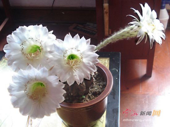 宁海新闻网讯 “我家的仙人球昨夜又开花了,还一下子开了4朵花,真是难得。”近日,家住车河社区的丁老伯高兴地将这一消息告诉邻居们。据丁老伯说,他家的仙人球是自己培育的,已经有四年了,今年从5月份到现在已经连续开了三次花,不过前两次每次都只开了两朵花。(姚亮葛优萍摄)