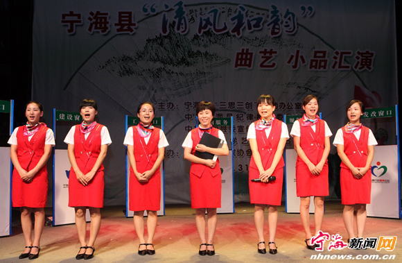 宁海新闻网讯 8月31日下午,由县“三思三创”活动办公室、县纪律检查委员会、县委宣传部、县文学艺术界联合会共同主办的“清风和韵”曲艺小品汇演在县越剧团举行。来自全县12个乡镇(街道)和公安、法院等13个部门选送的26个曲艺小品参加汇演,《庭长不在家》《“憨”书记》《家风》等小品赢得广大观众的阵阵掌声。活动评选出一、二、三等奖和若干优秀奖,县委常委、纪委书记李贵军出席颁奖仪式。图为正在表演县审管办选送的情景小品《窗口》。(记者李江林摄) |