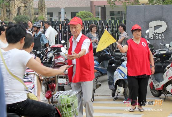 宁海新闻网讯 9月1日早晨,跃龙街道怡惠社区的“蒲公英”护苗志愿者正在辖区潘天寿小学门口引导小学生穿越马路入学。新学期开学第一天,各学校门口人、车混杂,交通显得非常拥挤。为保障学生上学安全,维护校前交通秩序,怡惠社区“蒲公英”护苗队的志愿者早早地就在潘天寿小学门口、正学路与气象路路口等地,协助交警维护交通秩序,引导小学生安全穿越马路。志愿者规范的动作、热情的态度,受到了学生与家长的好评。(惠广亮华立峰摄) |