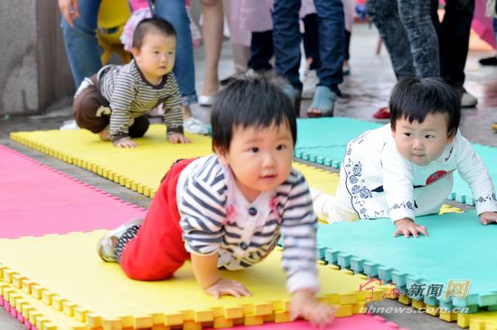 宁海新闻网讯 日前,记者走过潘天寿广场时,发现广场上正在举行亲子活动,现场很是热闹。虽然天下着雨,但是参加活动的家长和孩子们都非常兴奋,积极地参与各项活动。记者了解到,活动组织方是我县的一家幼儿教育培训机构,负责人说,现在的家长们很喜欢这样的亲子活动,报名的人非常多,即便下雨也是热情高涨。图为宝宝们爬行比赛的场景。(王银宁 西门人 摄) |