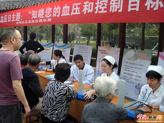 宁海新闻网讯 10月8日是全国第十四个高血压日,今年的主题是“知晓您的血压和控制目标”。杏树社区联合县城关医院在松鹤公园开展义诊活动,医生通过测量与大家交流,嘱咐居民朋友生活中应注意的事项和养成良好的习惯,共同关注自身健康。 (李江林柴溢摄)