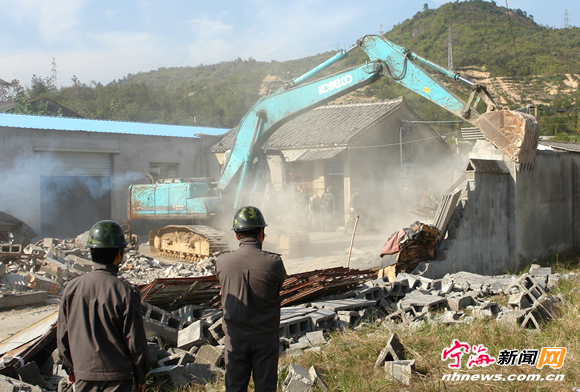 宁海新闻网讯 为使今年的县重点工程县再生资源交易市场建设工程能够早日进场施工,10月31日,跃龙街道会同县规划局、国土资源局、城管局等部门,组织人员对辖区双水村该重点工程规划地块内的几处违章建筑进行强制拆除。近年来,跃龙街道加大对违章建筑的整治力度,强化违章建筑处理机制,单今年就拆除各种违章建筑3万多平方米,有力地遏制了违法抢建现象。(惠广亮华建平摄)
