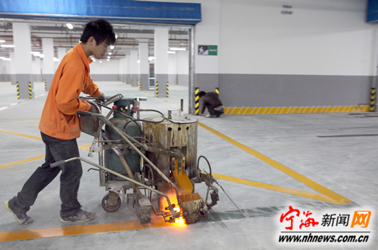 宁海新闻网讯 昨日上午,施工人员正在潘天寿广场地下车库划线。总投资5179万元的潘天寿广场地下人防工程,经过施工人员一年多的努力奋战,目前已进入扫尾阶段,地下室总建筑面积为9053平方米,供人防及地下停车两用,单层停车262辆,在战时为甲类单建掘开式兼顾式人防工程,抗力级别为防核武器6B级,防常规武器6级。该项目于2010年7月份开工建设,预计到今年12月份完工。目前地上绿化景观改造施工已完成95%左右。(李江林邵映菡摄) |