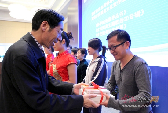 国家体育总局副局长冯建中向我县代表赠送全民健身文化宣传品。