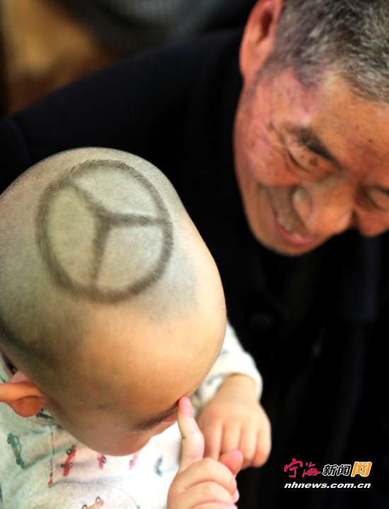 宁海新闻网讯 近日,记者在西店碰见一个头顶奔驰车标图案的小男孩,很另类,煞是吸引眼球。据孩子的父亲说,他在美发店要求美发师给孩子理一个特别点的发型,于是美发师灵感一来就有了这样一个另类发型。(记者姚亮摄)