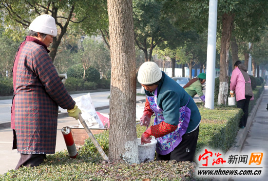 宁海新闻网讯 昨日上午,园林工人正在给正学东路的行道树涂白。为确保城区树木安全过冬,日前,县园林部门组织人员给城区和公园直径6厘米以上的树木穿上一层白色“保护衣”。据了解,这层白色“保护衣”含有石灰粉、农药、硫磺等,对树木具有防病虫害、保暖防冻作用,以确保明春树木正常生长。 (记者 李江林摄) |