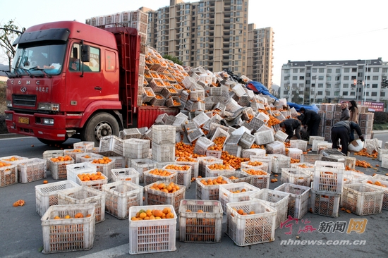 日前,一辆外地牌照满载着桔子的大货车,行驶到城区兴海路上时,因车厢栏板意外脱开,导致大半车桔子倾倒在马路中间,损失严重。 (记者 惠广亮 摄)