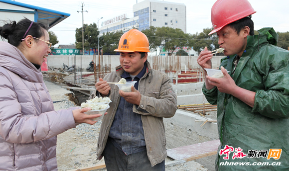 宁海新闻网讯 昨日,跃龙街道怡惠社区的一个建设工地上,来自湖北的几名工人正在品尝热腾腾的汤包,提前过上了元宵节。该社区在传统的元宵节之际,组织志愿者来到辖区的“外口之家”,与外来务工人员及其子女一起学做宁海元宵节传统食品汤包,热热闹闹地迎接元宵佳节的到来,并把蒸熟的汤包送到辖区的重点建设工地,让奋战在工地上的新宁海人也体验一下第二故乡的元宵风俗。(惠广亮 华立峰 摄) |