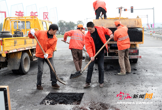宁海新闻网讯昨日上午,县公路局组织施工人员正在宁松线修补路面。为确保路段路况处于良好状态,县公路局在加强巡查的同时,组织人员对全县各凹坑路面进行及时填补维修,以确保路面平整,让车辆更安全地行驶。(记者李江林摄)