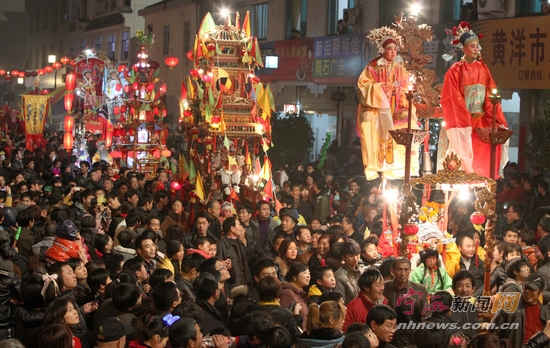 前童元宵行会万人空巷,盛大场面吸引了各地游客与四邻八乡全都赶来先睹为快。(记者惠广亮摄) 前童 又是一年元宵佳节,前童古镇也迎来了一年之中最热闹、喜庆的时刻。在古镇的大街小巷一只只火红的灯笼点缀其间,一个个小摊摆满了新旧两条大街,人们脸上洋溢着欢乐的微笑穿梭其间,或三五人一起说说笑笑,或一群人流连在摊位前挑选商品,这里俨然变成了一个盛大的民俗嘉年华。 说到前童的“十四夜”,这重头戏自然是元宵行会了。游行还未开始,却见大街小巷已经挤满了来自十里八乡的民众和省内外的游客,不论是古镇入口处的石子路边,还是鹿山脚下的石阶上,亦或是农家小院的门口都密密麻麻聚集着前来观看的人群。“噼里啪啦……”随着一阵鞭炮声响起,大家翘首以盼的前童元宵行会正式开始了。在古亭馆前面的广场上,几名身穿节日服装的老人在大旗引导下,走在队伍前面,紧接着鼓亭抬阁与秋千、腰鼓队、舞龙队相互衔接,穿插在其中,前后簇拥着乐队,一路上鼓乐齐鸣,人声鼎沸。 前童元宵行会这一风俗已经有500余年的历史,这种为庆祝、祈求丰收而进行的民俗游艺活动在江浙一带独具地方传统特色,可以说是独一无二。而元宵行会中最吸引眼球的就是一个个造型精美、朱金木雕的鼓亭抬阁。那鼓亭犹如一个个缩小版的亭台楼阁,层层亭阁精雕细刻,或画有精美的花鸟虫鱼,或雕有一个个逼真的人物形象,煞是好看。那抬阁则是一个个流动的小戏台,周边挂满一串串象征吉祥喜庆的小灯笼和五色彩旗,三五个男女娃娃装扮成戏曲人物,或凤冠霞帔,或顶戴花翎,或金盔铁甲,或坐或立置身于抬阁之中,恰似描绘着一个个美丽的故事。还有那身穿艳丽服装的舞龙队与腰鼓队穿插在浩浩荡荡的游行队伍中,在吉祥喜庆的音乐中进行着各自的表演。尤其是那娃娃腰鼓队,一边扭动着小身段,一边敲着铿锵有力的鼓声,在彩绸飞舞中把节日的气氛推向了又一个高潮。 在观看行会的人群中最为显眼的要数那些来自各地的摄影爱好者,他们犹如一个个打游击的游击队员手持着“长枪短炮”“潜伏”在阳台、窗口和弄堂间,以拍下最好看的照片。“这是我第一次来前童,一来到这里就被这独特的民风、民俗、民物所吸引了,特别是这元宵行会十分有特色,以前从来没见过规模如此大的民俗表演。”来自宁波的摄影爱好者陈先生在看完行会后说。(见习记者周韵健通讯员严洁) 黄坛 正月十四晚上,一场荟萃了雕刻、美术、戏剧、服饰等多种内涵的大型喜庆游乐活动在黄坛缤纷亮相。 当天下午,黄坛主要街道的两旁都挂上了大红灯笼,人人脸上洋溢着节日的喜悦。傍晚6点钟不到,潮水般的人流就开始从四面八方向镇中学大门口涌去,那里早已是彩球飘舞、鲜花锦簇,装扮一新的龙船、花灯等一字排开,整装待发,吸引众人围上前去抢先看个究竟。 到了6点左右,夜幕降临,黄坛庆元宵文化活动正式开始。一时间,七彩的烟花在夜空中绽放,两条舞龙在龙旗的指引下上下翻飞,狮子队、乐队、女子腰鼓队、秧歌队等紧随其后。浩浩荡荡的队伍在人群的簇拥下缓缓移动,长达数里之远,其精彩的表演让黄坛镇一展万民同乐的壮观景象。 据了解,为确保此次行会活动的圆满成功,黄坛镇党委、政府精心布置,明确职责,几百名工作人员全部统一着迷彩服上街做好安全保卫工作。(通讯员章亚丽) |