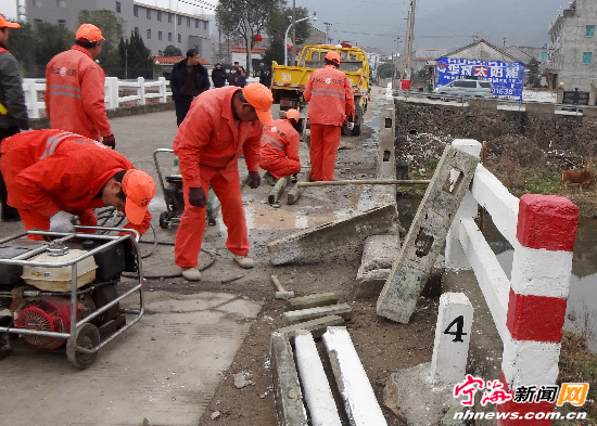 宁海新闻网讯 近日,县道越沙线19K+400东岙桥右侧栏杆被交通肇事损毁严重,影响过往车辆的安全。县公路局越溪养护站接到报警电话后,派员第一时间赶到现场,并立即组织施工人员、设备、材料等进行抢险修复,经过努力只用了一天时间,就全部完成修复,确保了安全通行。(姚亮 杜鹃摄)
