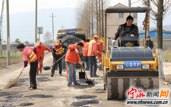 宁海新闻网昨日,县公路局岔路养护站的公路养护人员,利用近日的晴好天气正抓紧在县道城岭线填补路面坑洞。前阶段的连续阴雨天,给柏油路面的公路造成了严重的损害。连日来,县公路局抓住晴好天气,组织人力、物力,对全县辖区内损坏的柏油路面进行了全面修补,仅3天时间就投入30多万元,共填补坑洞或修复路面近5000平方米,确保了交通的安全顺畅。(惠广亮杜鹃摄) |
