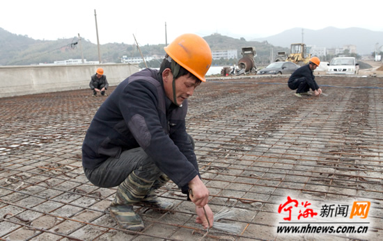 宁海新闻网讯 昨日上午,施工人员正在越沙线一期工程工地上扎丝作业。总投资2000万元的越沙线一期工程全长2.5公里、宽20米,该工程自去年6月份进场施工以来进展顺利,目前已完成基础路基铺设等工作,整个工程预计在2013年6月份完工。(李江林万崇文摄)