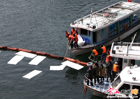 ⑤放吸油毡吸收水面油污。 (记者李江林摄)