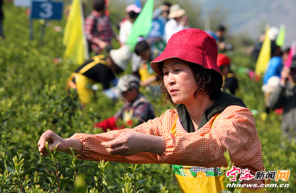 宁海新闻网讯 花语茶香春来早,最是桑洲风景好。4月7日上午,由县大型活动办公室、桑洲镇人民政府主办的宁海县第五届“望海茶”杯采茶大赛在桑洲镇福利茶场举行,来自跃龙街道、西店镇、一市镇、越溪乡等14个代表队的40余名采茶能手参加了这次比赛。经过一个小时的紧张角逐,胡陈乡代表队在茶叶采摘的质量和数量上略胜其他代表队,获第一名。(李江林 童晓静 摄)