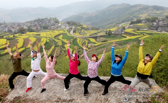 宁海新闻网讯 昨日,来自台州的一家户外瑜伽俱乐部的瑜伽爱好者正在以美轮美奂的桑洲油菜花作背景,开展户外瑜伽展示。阳春三月,桑洲的油菜花竞相开放,桑洲屿南山岗上金黄的油菜花漫山遍野,黄绿相间,美得让人流连忘返,每天吸引着众多的县内外游客前来游玩观赏。 (记者 惠广亮 摄)
