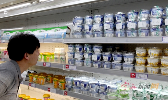 宁海新闻网讯 近日,“老酸奶、果冻等被指添加有工业明胶”的消息传出,尽管相关行业协会已经站出来为老酸奶正名,但依然难敌老酸奶人气的下跌。昨日中午,记者在城区一家大型超市里看到,酸奶柜台前显得有些冷清,一个品牌老酸奶正在以买二送一的方式打折销售。柜台营业员说,近几天老酸奶销售量明显减少。 (记者 惠广亮 摄) |