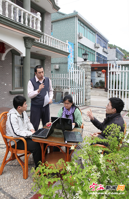 宁海新闻网讯 昨日,来自上海的几位年轻人正在桥头胡街道双林村5号双林农居的院子里悠闲地探讨着工作。这是上海旅游网的一个软件开发小组成员看中双林村这个美丽又清静的地方,特地来住上半个月,边休闲边进行课题研究。据悉,近年来,位于三麓潭景区的“双林农居”名声鹊起,如今已发展到16家,每天都会有游客来这里住宿,吃农家菜,假日周末更是一房难求。许多城里人都是拖家带口来游玩,体验乡村风情。(记者 惠广亮 摄)