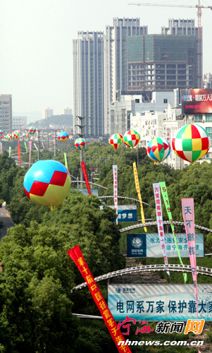街头彩球飞舞呈现一派热闹的节日氛围