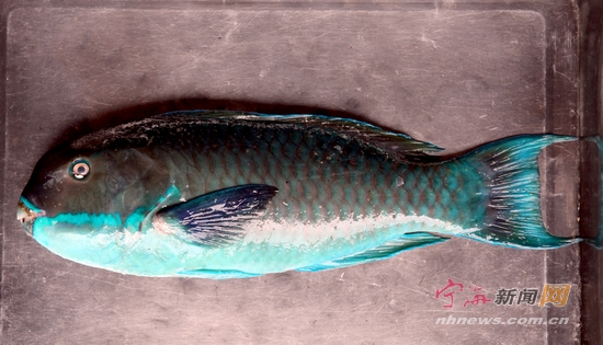 宁海新闻网讯 日前,力洋跳头村一姓蒋的渔民在海里捕到一条怪鱼,这条鱼长约30厘米,宽约10厘米,重约0.6公斤,这条鱼全身呈蓝绿色,鱼背部分浅淡,鱼肚部分颜色特别明显,而这条鱼的嘴巴很像鹦鹉,许多捕了几十年的渔民也不知道这是什么鱼。 (记者 李江林 摄)