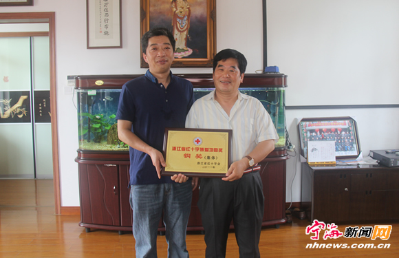 宁海新闻网讯 日前,县红十字会领导向宁波如意股份有限公司总裁储吉旺送上了“浙江省红十字博爱功勋奖铜奖(集体)”的奖牌,以表彰宁波如意股份有限公司在2010年时通过宁海县红十字会为玉树地震灾区捐款100万元的爱心善举。 (水玲玲 林玲伊 摄)