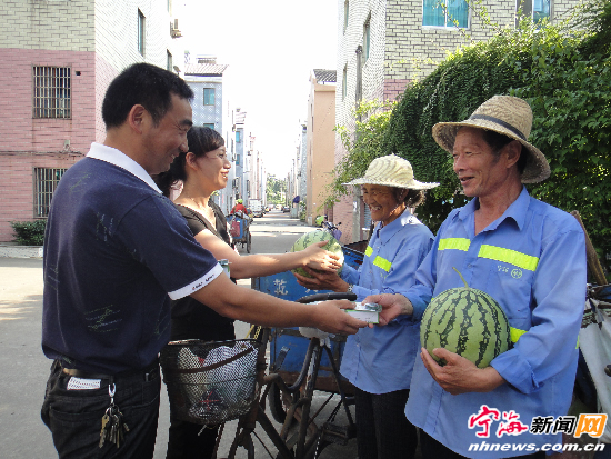 宁海新闻网讯 连日来持续高温,为使辖区环卫工人在工作量大增的情况下能够克服困难,安全度夏,桃源街道杜鹃社区工作人员给他们送去了人丹、藿香正气水、西瓜等夏季防暑物品表示慰问,让他们在炎炎夏日享受到一丝清凉。(姚亮王银燕摄)