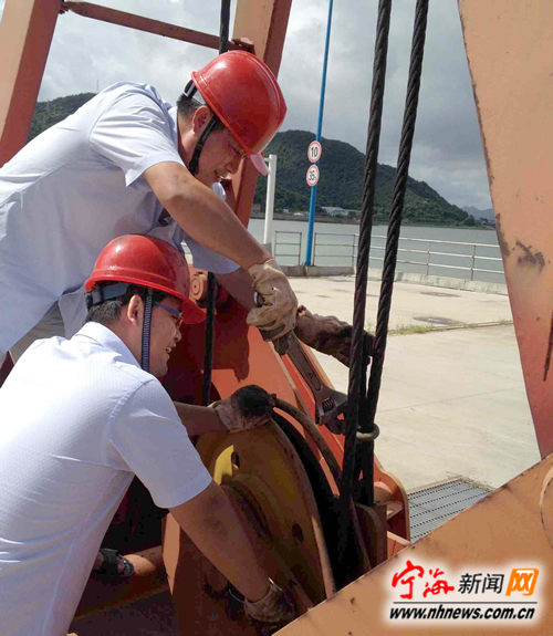 宁海新闻网讯 为确保港区、码头的生产安全,前日,由市、县质监局联合组成的安全检查组,对我县港区、码头的起重机等生产运行设备开展了安全检查。图为磨盘山码头工作人员正在配合检查组,进行起重机抓斗安全系数检查。(姚亮徐孝杰摄)