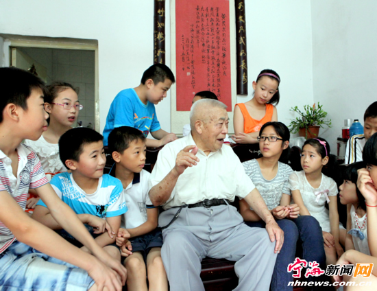 宁海新闻网讯 日前,跃龙街道塔山社区组织暑期假日学校的“小候鸟”来到军队离休干部黄茂泉老人家里,听老人讲述自己年轻时为民族解放事业走过的亲身经历。今年85岁高龄的黄茂泉老人1945年参加革命,曾参加过抗日战争和解放战争。(李江林王彦乃摄)