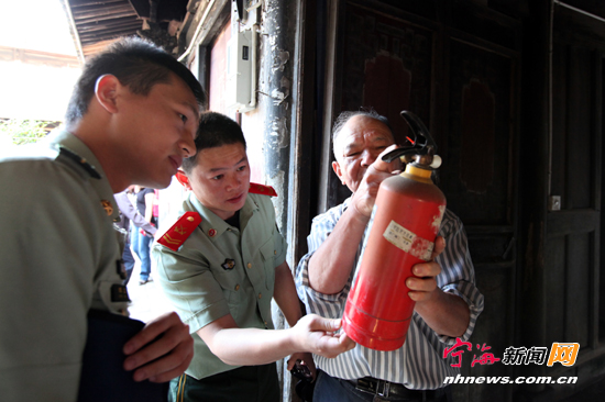 宁海新闻网讯 日前,县消防部门组织人员到前童古镇和黄坛等地,对辖区内的古民宅及古建筑进行消防安全突击检查。主要对一些消防设施受损和设备过时等情况进行更换和更新登记,并对检查中发现的安全隐患提出整改意见。图为消防人员正在检查黄坛古民宅中的灭火器。(记者李江林摄)