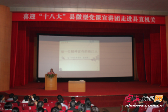 宁海新闻网讯 日前,为喜迎党的“十八大”,县委宣传部和县直机关党工委组织我县“微型党课”宣讲团走进机关,给全县200余名机关党员带去了以“我们的价值观”为主题的微型党课。(陈静珠赵景华摄)