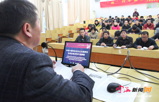 ![]() 宁海新闻网讯 日前,县技工学校举行十八大精神学习会,县十八大精神宣讲团成员林建军为该校全体教师作了《夺取中国特色社会主义新胜利的政治宣言和行动纲领》专题讲座。围绕学习、宣传、贯彻党的十八大精神这条主线,对十八大报告进行了深入浅出的讲解剖析,让大家深刻领会十八大提出的新思想、新观点、新要求,并运用这些最新理论成果武装头脑,指导实践,推动教学工作。 (记者惠广亮摄) |
