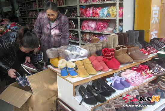 宁海新闻网讯 天气越来越冷,火了市场上的各种保暖棉鞋。城区桃源路上一家棉鞋经营户告诉记者,近来买手工棉鞋、雪地靴的市民络绎不绝,销量比平时多一半还不止。(记者 惠广亮摄)