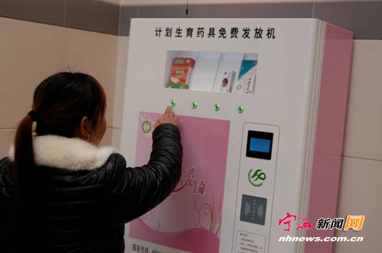 宁海新闻网讯 日前,县计生指导站在一楼服务大厅安装了一台智能化免费避孕药具自助发放机,育龄群众凭借身份证便可自助领取避孕套、栓等避孕药具,操作简单,快捷方便。 (潘旭婷应俊斌摄)