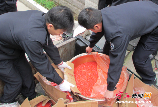 宁海新闻网讯 近日,桃源街道食安办联合县质监局、城区食监所、桃源工商所等部门,联合行动对该街道下潘村一家无证照加工里脊肉串的黑作坊进行查处,当场查获含有添加染色剂等违禁配料的肉制品80余斤,并将该作坊予以查封取缔。(惠广亮金晓丽摄)