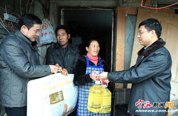 宁海新闻网讯 昨日上午,县民政局有关人员来到跃龙街道蒲岙自然村,慰问在这里暂住的贫困户夏必永家。据了解,夏必永女儿患重病,家境十分贫寒,县民政局干部了解情况后,及时为他们送去了大米、食用油、被子等慰问品,让他们感受到社会大家庭的温暖。(李江林 华建平 摄)